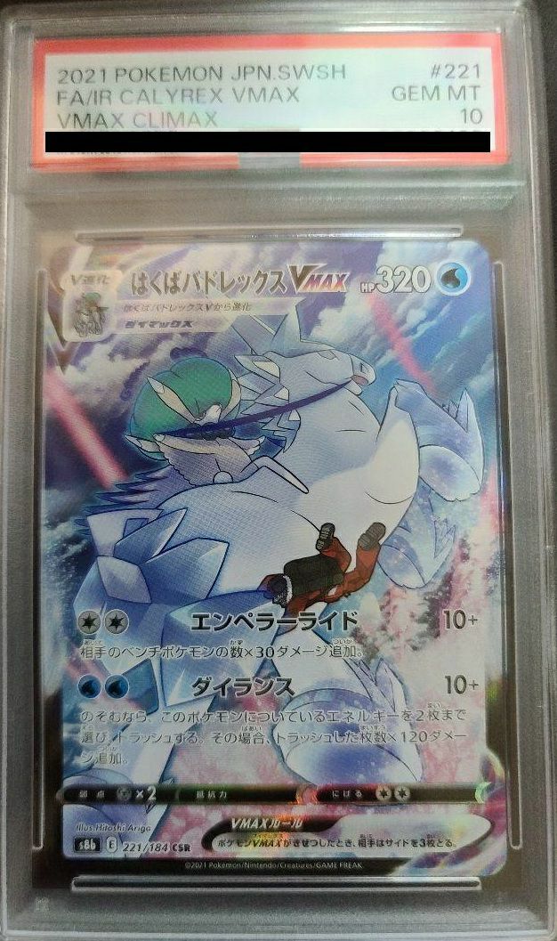 はくばバドレックスVMAX(221/184)[CSR]は、ハイクラスパック「VMAXクライマックス」に収録された水タイプのポケモンVMAXです。HPは320と高く、耐久性に優れています。ワザ「エンペラーライド」は、相手のベンチポケモンの数×30ダメージを追加する効果を持ち、最大160ダメージを狙えます。「ダイランス」は、望むならこのポケモンについているエネルギーを2枚までトラッシュし、その枚数×120ダメージを追加する強力なワザです。特別なルールとして、ポケモンVMAXがきぜつしたとき、相手はサイドを3枚取ります。CSR(キャラクタースーパーレア)仕様のこのカードは、美麗なイラストが特徴で、コレクション性も高い一枚です。