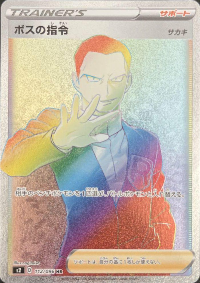 「ボスの指令(サカキ)」(112/096)は、拡張パック「反逆クラッシュ」に収録されたハイパーレア(HR)のサポートカードで、ロケット団のボス「サカキ」が描かれています。このカードは、相手のベンチポケモンを1匹選び、バトルポケモンと入れ替える効果を持ち、相手の戦略を崩すのに有効です。サポートカードは1ターンに1枚しか使用できないため、使用タイミングが重要となります。その希少性と人気から、コレクターの間で高い評価を受けています。