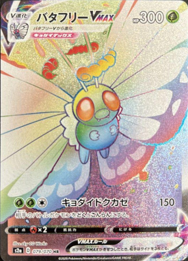 バタフリーVMAX(079/070)は、草タイプのポケモンVMAXで、HPは300です。ワザ「キョダイドクカゼ」は草エネルギー2つと無色エネルギー1つで150ダメージを与え、相手のバトルポケモンをどくとこんらん状態にします。弱点は炎タイプで、逃げるためのエネルギーは0です。デッキでは、相手の行動を制限しつつ安定したダメージを与えるアタッカーとして活躍します。HR(ハイパーレア)版は、虹色に輝く美麗なイラストが特徴で、コレクション性も高いです。