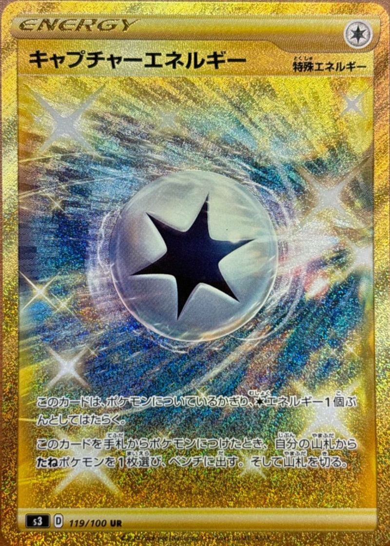 キャプチャーエネルギー(119/100)は、拡張パック「ムゲンゾーン」に収録された特殊エネルギーカードで、ポケモンに付けると無色エネルギー1個分として機能します。このカードを手札からポケモンに付けた際、自分の山札からたねポケモンを1枚選び、ベンチに出すことができます。これにより、エネルギー供給とベンチの展開を同時に行うことが可能で、デッキの安定性を高めるのに役立ちます。UR(ウルトラレア)版は、特別な光沢を持つイラストが施され、コレクション性が高いです。