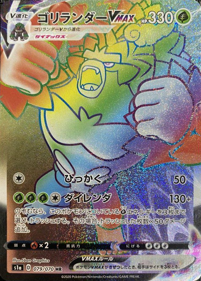 ゴリランダーVMAX(079/070)は、強化拡張パック「VMAXライジング」に収録された草タイプのポケモンVMAXで、HPは330です。ワザ「ひっかく」は50ダメージを与えます。「ダイレンダ」は130ダメージを与え、望むならこのポケモンについているエネルギーを3枚までトラッシュし、その場合、トラッシュした枚数×50ダメージを追加できます。ポケモンVMAXがきぜつしたとき、相手はサイドを3枚取ります。イラストは5ban Graphics氏が担当しています。
