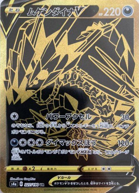 ムゲンダイナV(327/190)[UR]は、悪タイプのたねポケモンで、HPは220です。ワザ「パワーアクセル」は無色エネルギー1個で30ダメージを与え、手札から悪エネルギーを1枚ベンチポケモンにつけることができます。ワザ「ダイマックスほう」は悪エネルギー1個と無色エネルギー3個で120ダメージを与え、相手のバトルポケモンが「ポケモンVMAX」の場合、追加で120ダメージを与えます。弱点は闘タイプ(×2)、抵抗力はなく、逃げるためのエネルギーは2個です。デッキでは、エネルギー加速と高火力を兼ね備え、特にVMAXポケモンに対して強力なアタッカーとして活躍します。イラストは、金色に輝くムゲンダイナが描かれ、ウルトラレア仕様の豪華なデザインが特徴です。