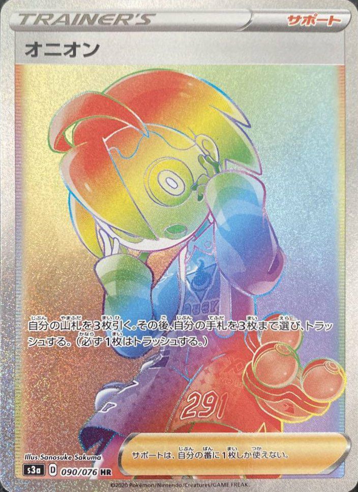 オニオン(090/076)[HR]は、サポートカードで、自分の山札を3枚引き、その後、手札から3枚まで選んでトラッシュする効果を持ちます。必ず1枚はトラッシュする必要があります。これにより、手札の入れ替えやトラッシュを活用する戦略に役立ちます。HR(ハイパーレア)版は、虹色のホログラム加工が施され、豪華なデザインが特徴です。このカードは、強化拡張パック「伝説の鼓動」に収録されています。