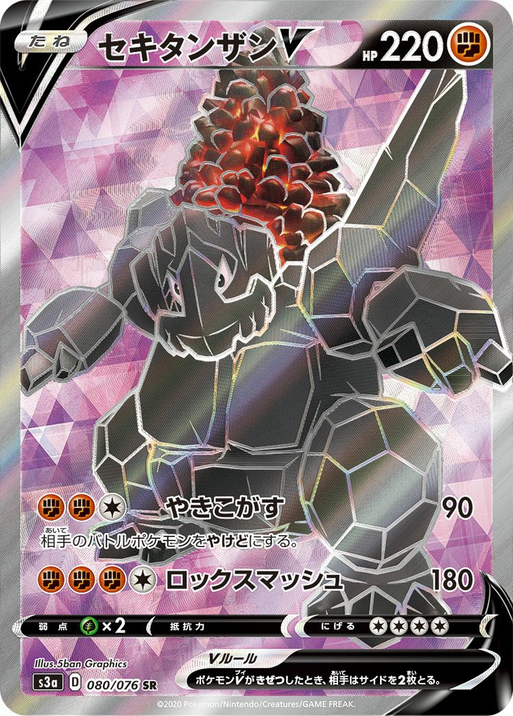 セキタンザンV(080/076)は、強化拡張パック「伝説の鼓動」に収録された闘タイプのたねポケモンVで、HPは220です。技「やきこがす」は闘エネルギー2個と無色エネルギー1個で90ダメージを与え、相手のバトルポケモンをやけど状態にします。技「ロックスマッシュ」は闘エネルギー3個と無色エネルギー1個で180ダメージを与えます。弱点は草タイプ(×2)、逃げるためのエネルギーは4個です。SR(スーパーレア)版は、イラストレーターの5ban Graphics氏による特別なイラストが特徴で、コレクターから高い人気を集めています。