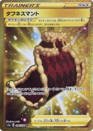 タフネスマント(094/076)は、強化拡張パック「伝説の鼓動」に収録されたウルトラレアのグッズカードです。この「ポケモンのどうぐ」をたねポケモン(ポケモンGXを除く)に付けると、そのポケモンの最大HPが50増加します。これにより、バトルでの耐久力を高めることが可能です。グッズカードは自分の番に何枚でも使用できるため、タフネスマントを活用することで、デッキの戦略に柔軟性を持たせることができます。イラストはinose yukie氏が担当し、洗練されたデザインが特徴です。