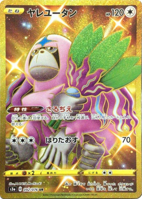 ヤレユータン(092/076)は、HP120の無色タイプのたねポケモンです。特性「さるぢえ」により、自分の番に1回、手札の1枚と山札の一番上のカードを入れ替えることができます。ワザ「はりたおす」は、無色エネルギー3個で70ダメージを与えます。この特性は、手札の調整やデッキトップの操作に役立ち、デッキの安定性を高めるサポート役として活躍します。UR版は、豪華なイラストと光沢が特徴で、コレクション性も高いカードです。