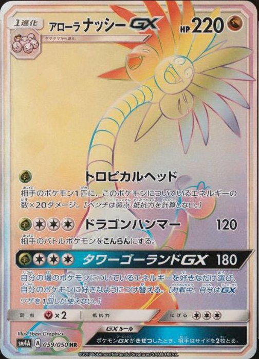 アローラナッシーGX(059/050)は、拡張パック「超次元の暴獣」に収録されたドラゴンタイプの1進化ポケモンGXで、ハイパーレア(HR)仕様のカードです。ワザ「トロピカルヘッド」は、このポケモンについているエネルギーの数×20ダメージを相手のポケモン1匹に与えます(ベンチポケモンにも攻撃可能で、弱点・抵抗力を計算しません)。「ドラゴンハンマー」は120ダメージを与え、相手のバトルポケモンをこんらん状態にします。GXワザ「タワーゴーランドGX」は180ダメージを与え、自分の場のポケモンについているエネルギーを好きなだけ選び、自分の他のポケモンに好きなようにつけ替えることができます。これらのワザにより、柔軟なエネルギー操作と強力な攻撃が可能で、デッキの戦略性を高めます。HR版のカードは、豪華なデザインが特徴で、コレクターから高い評価を受けています。