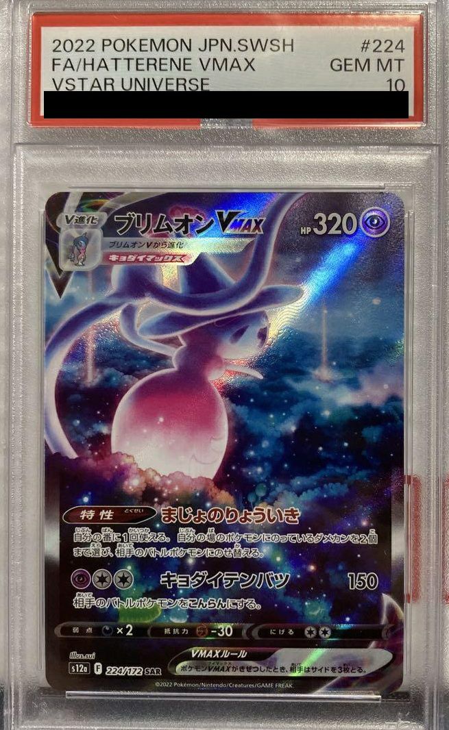 ブリムオンVMAX(224/172)は、ハイクラスパック「VSTARユニバース」に収録された超タイプのポケモンVMAXで、HPは320です。特性「まじょのりょういき」により、自分の番に1回、自分の場のポケモンにのっているダメカンを2個まで相手のバトルポケモンに移すことができます。ワザ「キョダイテンバツ」は超エネルギー1つと無色エネルギー2つで150ダメージを与え、相手のバトルポケモンをこんらん状態にします。弱点は悪タイプ、抵抗力は闘タイプで、逃げるためのコストは2です。特性を活かしてダメカンを操作し、ワザで相手をこんらんにすることで、戦況を有利に進めることができます。スペシャルアートレア(SAR)版のイラストは、幻想的な夜空を背景にブリムオンVMAXが描かれており、その美しさがコレクターから高い評価を受けています。