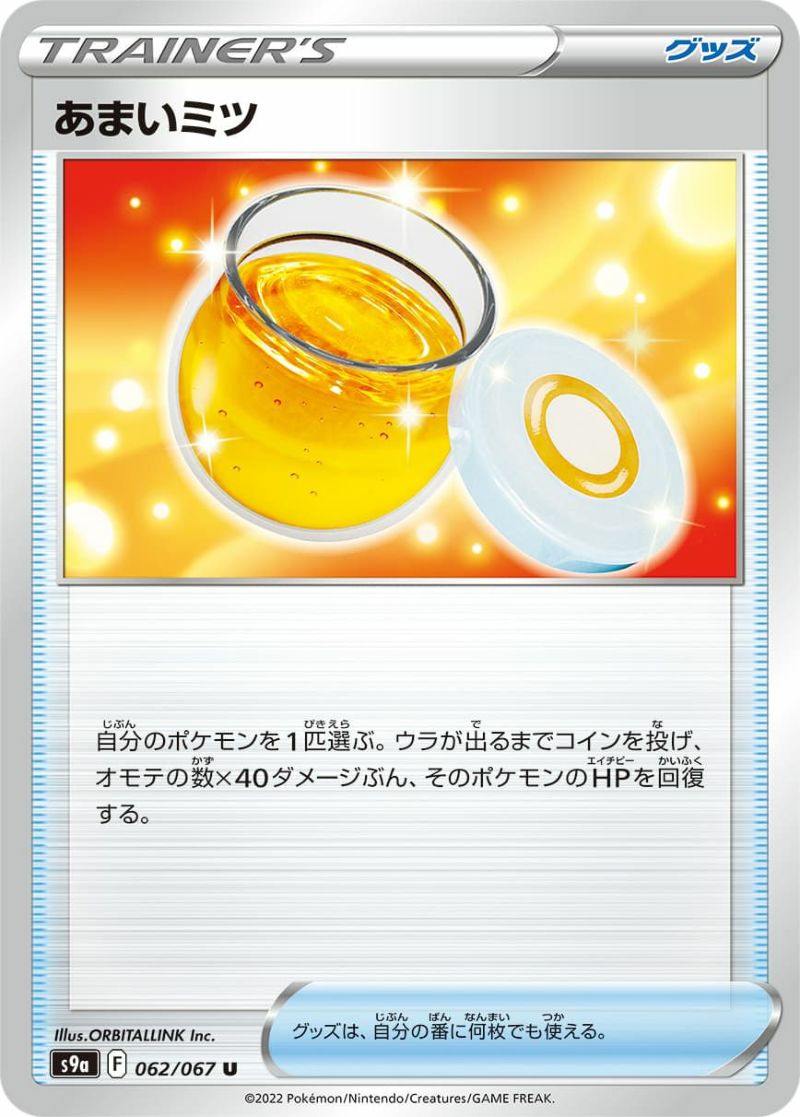あまいミツ(062/067)は、ポケモンカード「バトルリージョン」に収録されたグッズカードです。自分のポケモン1匹を選び、コインを投げてオモテが出るごとに40ダメージ分のHPを回復する効果があります。コイン投げはウラが出るまで続けるため、ランダム性がありつつも、複数回の使用が可能で回復役として役立ちます