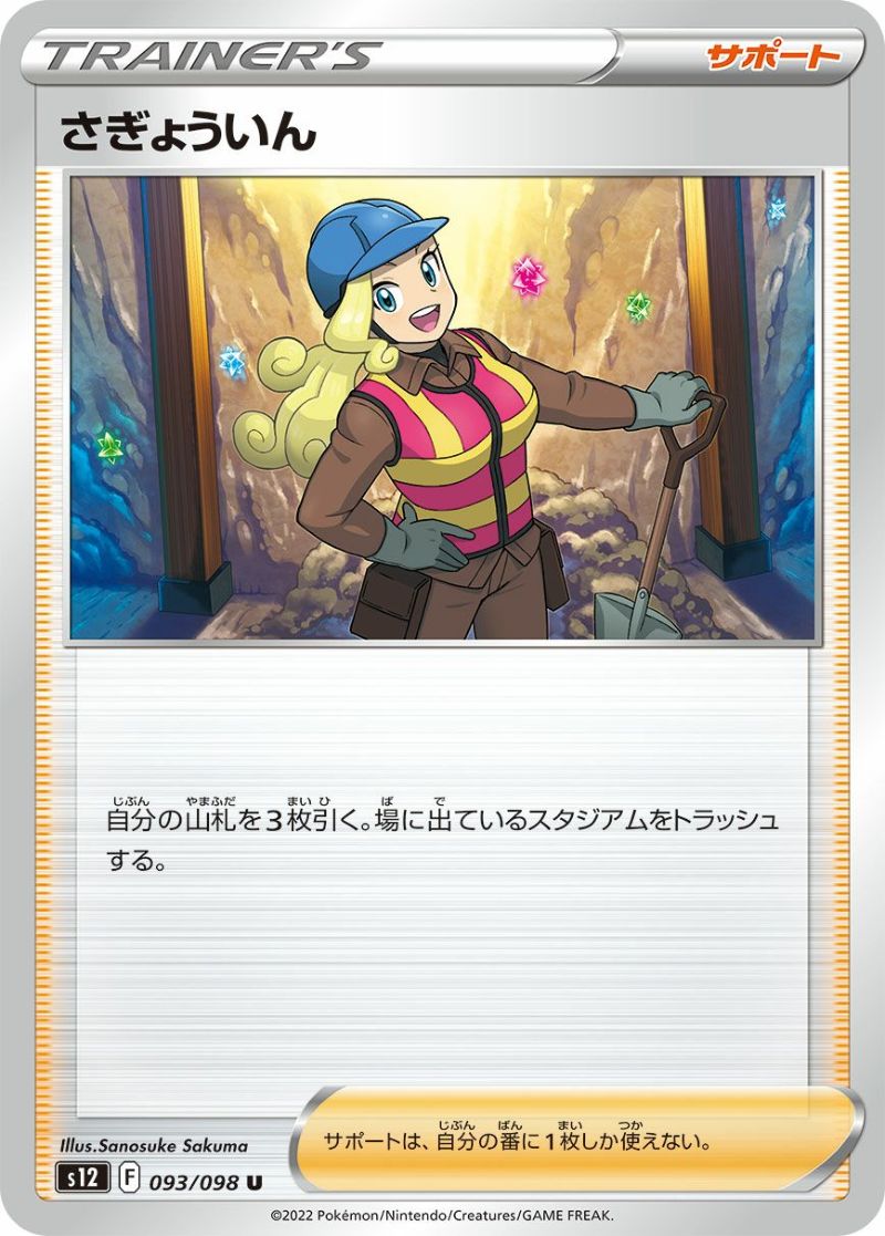 さぎょういん(093/098)は、拡張パック「パラダイムトリガー」に収録されたサポートカードです。このカードを使用すると、自分の山札を3枚引き、場に出ているスタジアムをトラッシュすることができます。これにより、手札を増やしつつ、相手の戦略に影響を与えるスタジアムを除去することが可能です。ただし、サポートカードは自分の番に1枚しか使えない点に注意が必要です。
