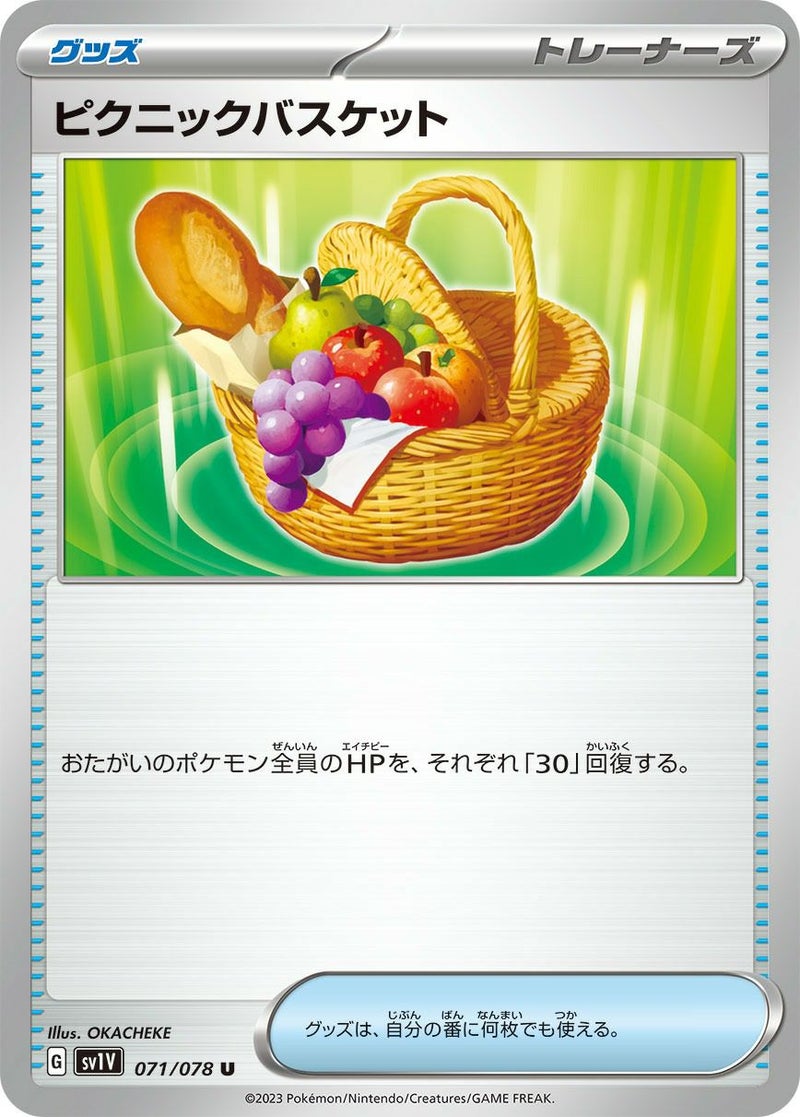 ピクニックバスケット(071/078)は、拡張パック「バイオレットex」に収録されたグッズカードです。このカードを使用すると、お互いのポケモン全員のHPをそれぞれ30回復します。グッズは自分の番に何枚でも使えるため、複数回の使用で大きな回復効果を狙うことが可能です。特に、複数のポケモンがダメージを受けている状況で効果的に活用できます。