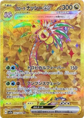 アローラナッシーex(092/064)は、強化拡張パック「楽園ドラゴーナ」に収録されたドラゴンタイプの1進化ポケモンexで、ウルトラレア(UR)仕様のカードです。テラスタルの特性により、ベンチにいる限りワザのダメージを受けません。ワザ「トロピカルフィーバー」は150ダメージを与えつつ、山札から基本エネルギーを好きなだけ選び、自分のポケモンに好きなようにつけることができます。また、「ブンブンスフェーン」はコインを1回投げ、オモテなら相手のバトル場のたねポケモンを、ウラなら相手のベンチのたねポケモンを1匹きぜつさせる強力な効果を持ちます。このUR版のカードは、豪華なデザインが特徴で、コレクターから高い評価を受けています。