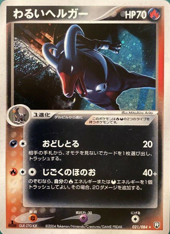 わるいヘルガー(021/084)は、2004年10月15日に発売された拡張パック「ロケット団の逆襲」に収録された炎・悪の2タイプを持つ1進化ポケモンで、レアリティは★(レア)です。HPは70で、ワザ「おどしとる」は悪エネルギー1個で20ダメージを与え、相手の手札からランダムに1枚をトラッシュします。「じごくのほのお」は炎エネルギー1個と無色エネルギー2個で40ダメージを与え、望むなら自分の炎エネルギーまたは悪エネルギーを1個トラッシュすることで、20ダメージを追加できます。弱点は闘タイプ(×2)、抵抗力は超タイプ(-30)、逃げるためのエネルギーは0個です。進化前はデルビルで、イラストはMitsuhiro Arita氏が担当しています。