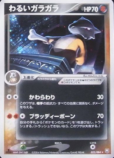 わるいガラガラ(052/084)は、2004年10月15日に発売された拡張パック「ロケット団の逆襲」に収録された闘・悪の2タイプを持つ1進化ポケモンで、レアリティは★(レア)です。HPは70で、ワザ「かわらわり」は無色エネルギー2個で30ダメージを与え、相手の抵抗力や効果を無視してダメージを与えます。ワザ「ブラッディーボーン」は闘エネルギー2個と無色エネルギー1個で70ダメージを与えますが、自分の手札からポケモンのカードを1枚トラッシュする必要があります(トラッシュできない場合、このワザは失敗します)。弱点は草タイプ(×2)、抵抗力はなく、逃げるためのエネルギーは2個です。進化前はカラカラで、イラストはMitsuhiro Arita氏が担当しています。