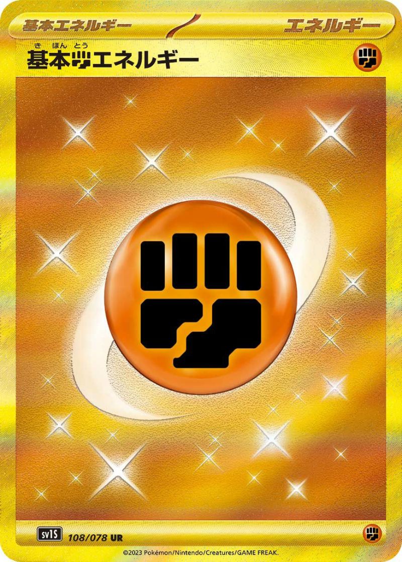 基本闘エネルギー(108/078)[UR]は、拡張パック「スカーレットex」に収録されたウルトラレア仕様の基本エネルギーカードです。闘タイプのポケモンにエネルギーを供給する際に使用されます。UR(ウルトラレア)仕様のカードは、豪華なホイル加工が施され、特にコレクターから高い人気を集めています。デッキ構築においては、闘タイプのポケモンを中心としたデッキで使用されることが多いです。