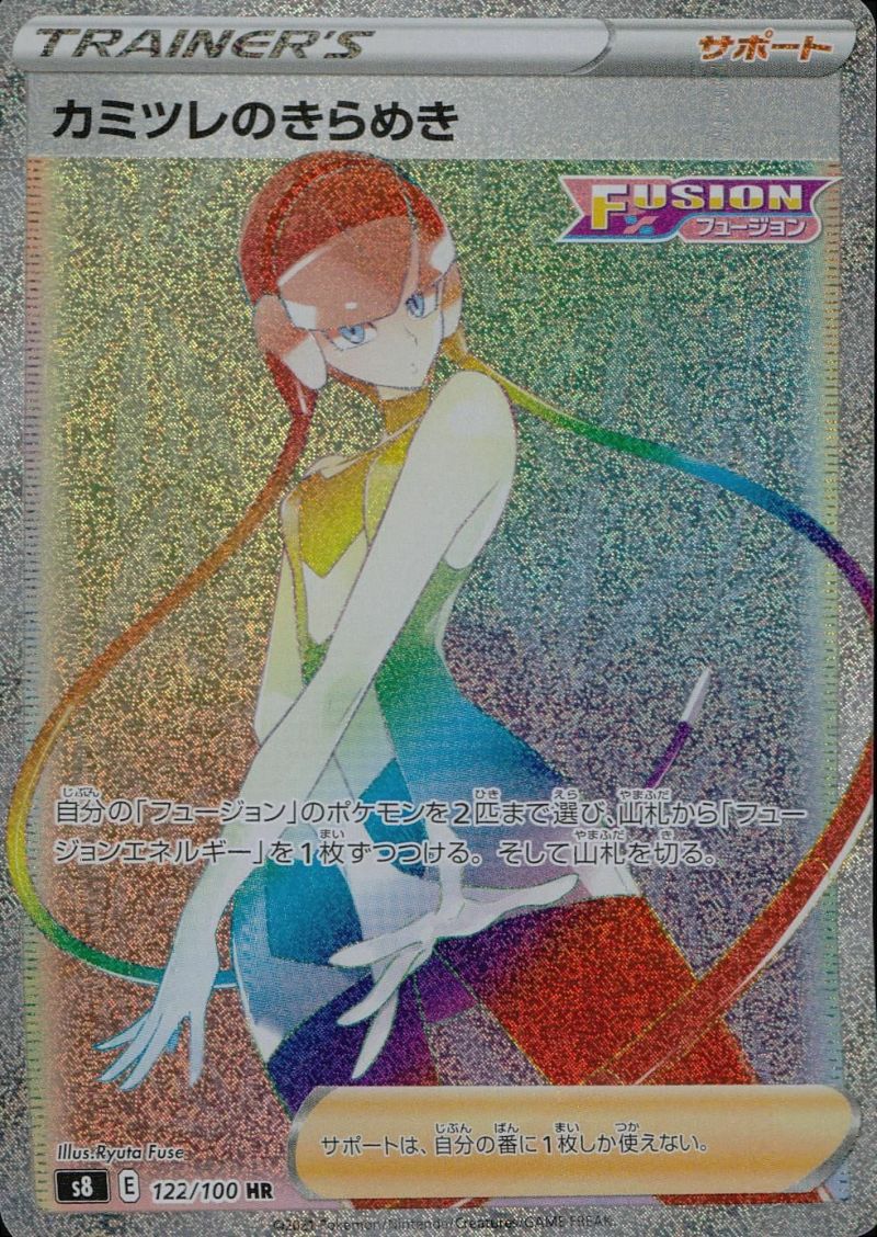 カミツレのきらめき(122/100)[HR]は、拡張パック「フュージョンアーツ」に収録されたサポートカードで、フュージョンデッキのエネルギー加速をサポートします。HR(ハイパーレア)仕様のこのカードは、光沢のある特別なデザインが施され、コレクターズアイテムとしても人気があります。
