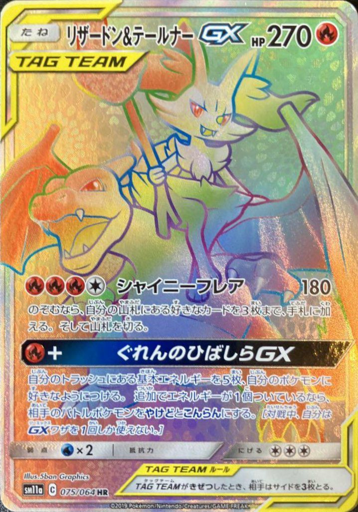 リザードン&テールナーGX(075/064)は、2019年7月5日に発売された強化拡張パック「リミックスバウト」に収録された炎タイプのTAG TEAMポケモンGXで、レアリティはHR(ハイパーレア)です。HPは270で、ワザ「シャイニーフレア」は炎エネルギー3個で180ダメージを与え、望むなら山札から好きなカードを3枚まで手札に加え、その後山札を切ります。GXワザ「ぐれんのひばしらGX」は、トラッシュにある基本エネルギーを5枚、自分のポケモンに好きなようにつける効果を持ち、追加でエネルギーが1個ついているなら、相手のバトルポケモンをやけどとこんらんにします。弱点は水タイプ(×2)、抵抗力はなく、逃げるためのエネルギーは3個です。デッキでは、高い攻撃力と手札補充能力を兼ね備え、GXワザでエネルギー加速も可能なため、さまざまな戦術に対応できます。TAG TEAMがきぜつしたとき、相手はサイドを3枚取る特別なルールが適用されます。HR版のイラストは、リザードンとテールナーが共に描かれた美麗なデザインが特徴で、コレクターから高い評価を受けています。