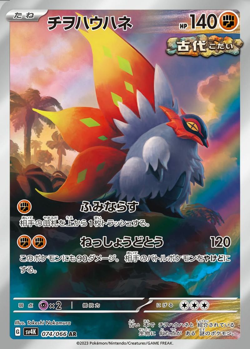 チヲハウハネ(074/066)[AR]は、拡張パック「古代の咆哮」に収録された闘タイプのたねポケモンカードです。HPは140で、ワザ「ふみならす」は相手の山札を上から1枚トラッシュし、「ねっしょうどとう」は120ダメージを与え、相手のバトルポケモンをやけど状態にしますが、このポケモンにも90ダメージを受けます。これらのワザにより、相手のデッキ破壊や高火力攻撃が可能ですが、自身へのダメージも考慮する必要があります。AR(アートレア)版のイラストは、チヲハウハネが夜の森で佇む幻想的な姿が描かれており、ファンから高い評価を受けています。