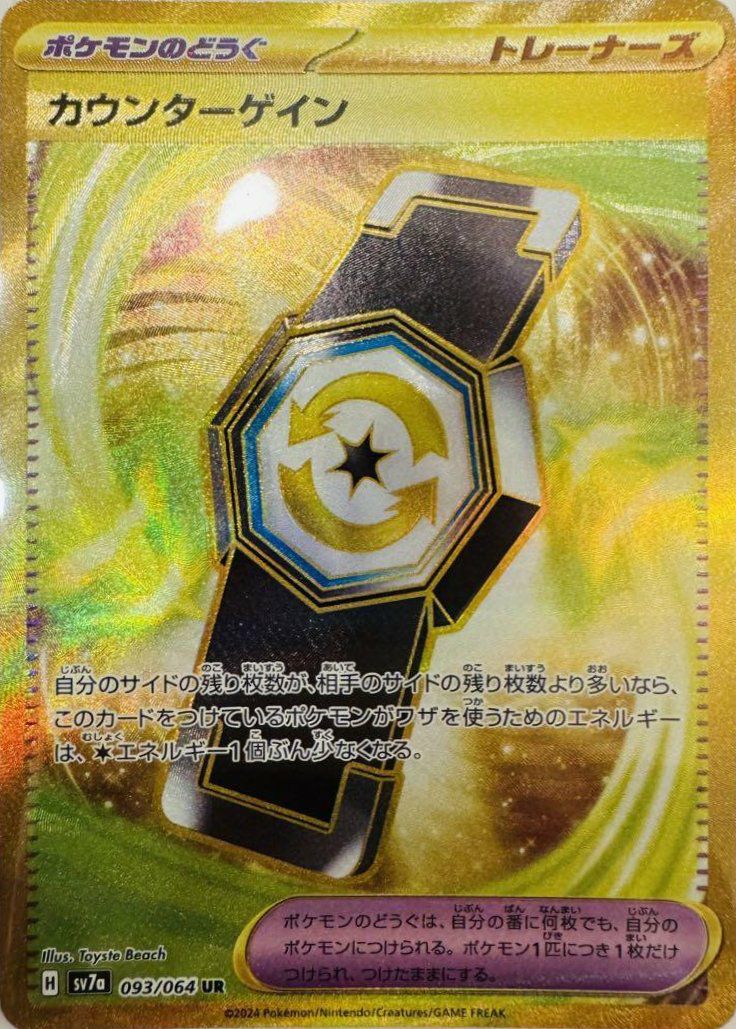 カウンターゲイン(093/064)は、強化拡張パック「楽園ドラゴーナ」に収録されたグッズカード「ポケモンのどうぐ」です。自分のサイドの残り枚数が相手より多い場合、このカードを付けたポケモンのワザに必要なエネルギーが無色エネルギー1個分少なくなります。デッキでは、劣勢時のエネルギーコスト軽減手段として活用されます。UR(ウルトラレア)版のカードは、金色に輝く特別なホログラフィック加工が施され、美麗なデザインが特徴です。