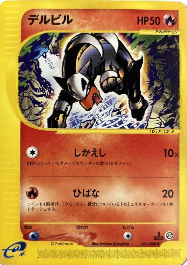 デルビル(021/088)は、拡張パック「神秘なる山」に収録された炎タイプのたねポケモンです。ワザ「しかえし」は、自分にのっているダメージカウンターの数×10のダメージを与え、「ひばな」は20ダメージを与えますが、コインを投げて「うら」なら自身の炎エネルギーを1枚トラッシュします。HPは50で、弱点は水タイプ(×2)です。このカードは、ダメージを受けた際に「しかえし」で大きなダメージを狙えるため、戦略的なプレイが求められます。