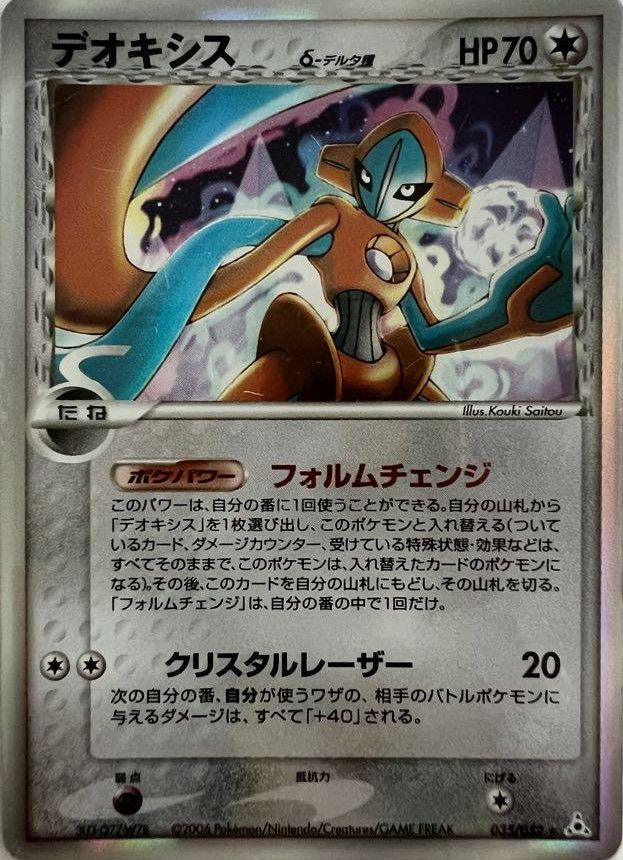 デオキシスδ-デルタ種(035/052)は、拡張パック「ホロンの幻影」に収録された無色タイプのたねポケモンです。特性「フォルムチェンジ」により、自分の山札から「デオキシス」を1枚選び、このポケモンと入れ替えることができます。ワザ「クリスタルレーザー」は20ダメージを与え、次の自分の番に使うワザのダメージを40増加させます。このカードは、状況に応じたデオキシスの形態変化を活かし、戦略的なプレイが可能です。また、レアリティ「★」のカードで、コレクション性も高い一枚です。