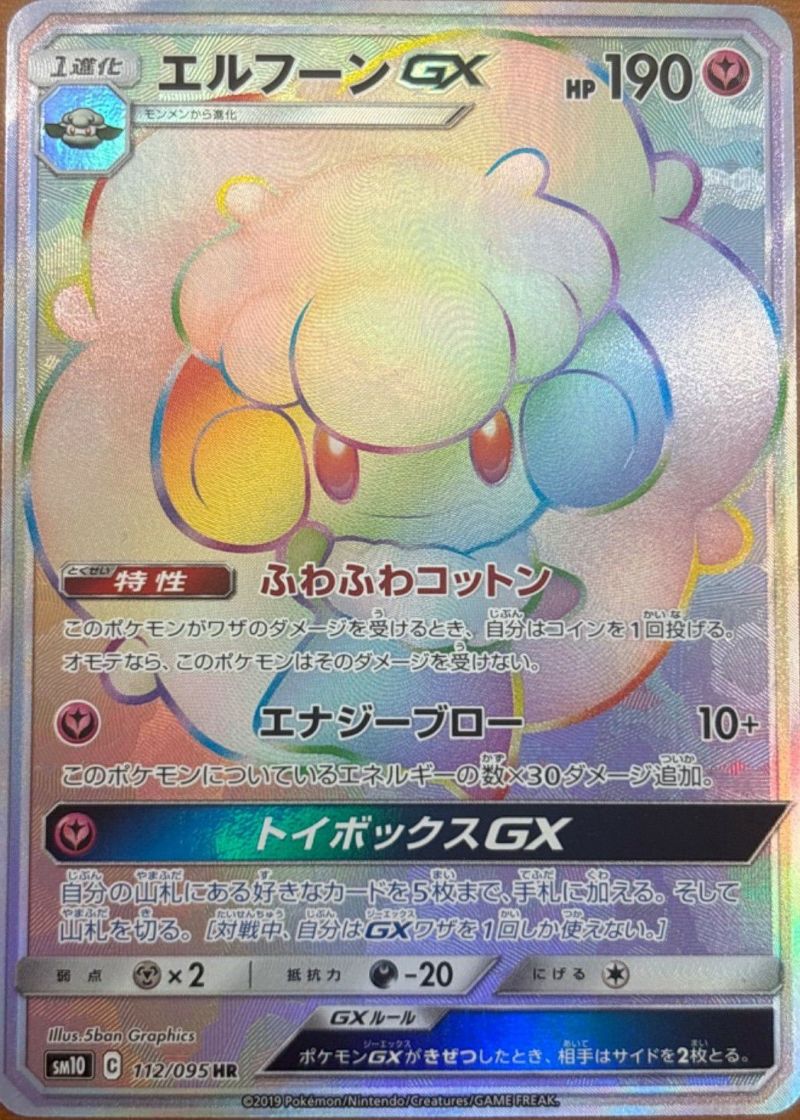 エルフーンGX(112/095)は、拡張パック「ダブルブレイズ」に収録されたフェアリータイプの1進化ポケモンで、HP190を持ちます。特性「ふわふわコットン」は、このポケモンがワザのダメージを受けるとき、コインを1回投げてオモテならそのダメージを無効化する効果があります。ワザ「エナジーブロー」は、フェアリーエネルギー1個で10ダメージを与え、さらにこのポケモンについているエネルギーの数×30ダメージを追加します。GXワザ「トイボックスGX」は、山札から好きなカードを5枚まで手札に加えることができ、戦略的な手札補充が可能です。HR(ハイパーレア)版は、虹色の光沢を持つ特別なデザインが施されています。