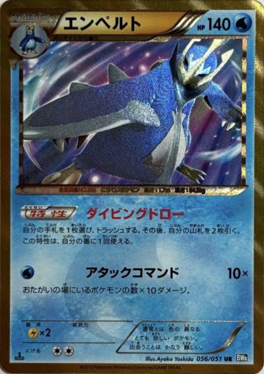 エンペルト(056/051)[UR]は、HP140の水タイプの2進化ポケモンで、特性「ダイビングドロー」により、手札を1枚トラッシュして山札から2枚引くことができます。ワザ「アタックコマンド」は、お互いの場にいるポケモンの数×10ダメージを与えます。デッキでは、ドローサポートと安定したダメージソースとして活躍します。UR(ウルトラレア)版は、特別なホログラム加工が施され、コレクション価値が高いのが特徴です。