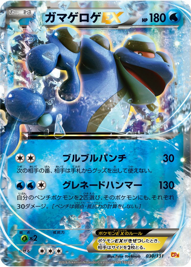 ガマゲロゲEX(030/131)[RR]は、HP180の水タイプのたねポケモンEXです。ワザ「ブルブルパンチ」は、無色エネルギー2個で30ダメージを与え、次の相手の番に手札からグッズを使えなくします。「グレネードハンマー」は、水エネルギー2個と無色エネルギー1個で130ダメージを与えますが、自分のベンチポケモン2匹にそれぞれ30ダメージを負わせます。これらのワザにより、相手の戦略を妨害しつつ高火力を発揮できます。デッキでは、相手の行動を制限しながら攻撃を展開する戦術に適しています。