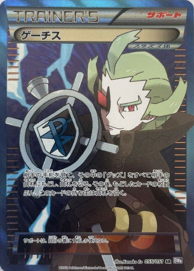 ゲーチス(055/051)[SR]は、拡張パック「ラセンフォース」に収録されたサポートカードです。効果は、相手の手札を確認し、その中のグッズをすべて山札に戻してシャッフルし、その枚数分だけ自分が山札を引くというものです。これにより、相手の戦略を妨害しつつ、自分の手札を増やすことが可能です。SR(スーパーレア)仕様のため、イラストが豪華に描かれています。