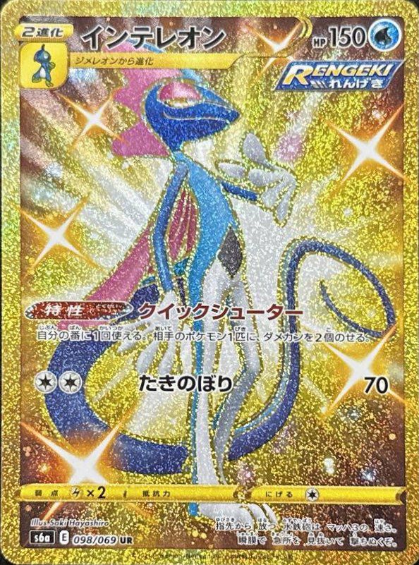 インテレオン(098/069)は、HP150の水タイプの2進化ポケモンで、特性「クイックシューター」を持ちます。この特性は、自分の番に1回、相手のポケモン1匹にダメカンを2個のせることができます。ワザ「たきのぼり」は70ダメージを与えます。UR(ウルトラレア)仕様は、特別なデザインで、コレクション性が高いです。デッキでは、特性を活かしてベンチポケモンにもダメージを与え、戦況を有利に進める戦術が可能です。