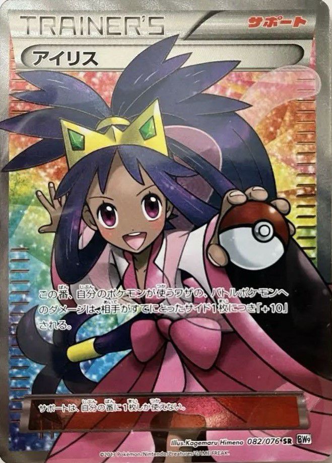 「アイリス」(082/076)は、拡張パック「メガロキャノン」に収録されたサポートカードのスーパーレア(SR)版です。このカードを使用すると、その番に自分のポケモンがバトルポケモンへ与えるワザのダメージが、相手がすでに取ったサイド1枚につき10増加します。イラストは姫野かげまる氏が手掛けており、アイリスがモンスターボールを片手に無邪気な笑顔を見せるデザインが特徴です。発売当初の買取価格は約3,000円でしたが、2024年12月9日時点では約180,000円まで高騰しています。これは、収録パックの絶版による希少性や、キャラクターの人気の高さが影響しています。