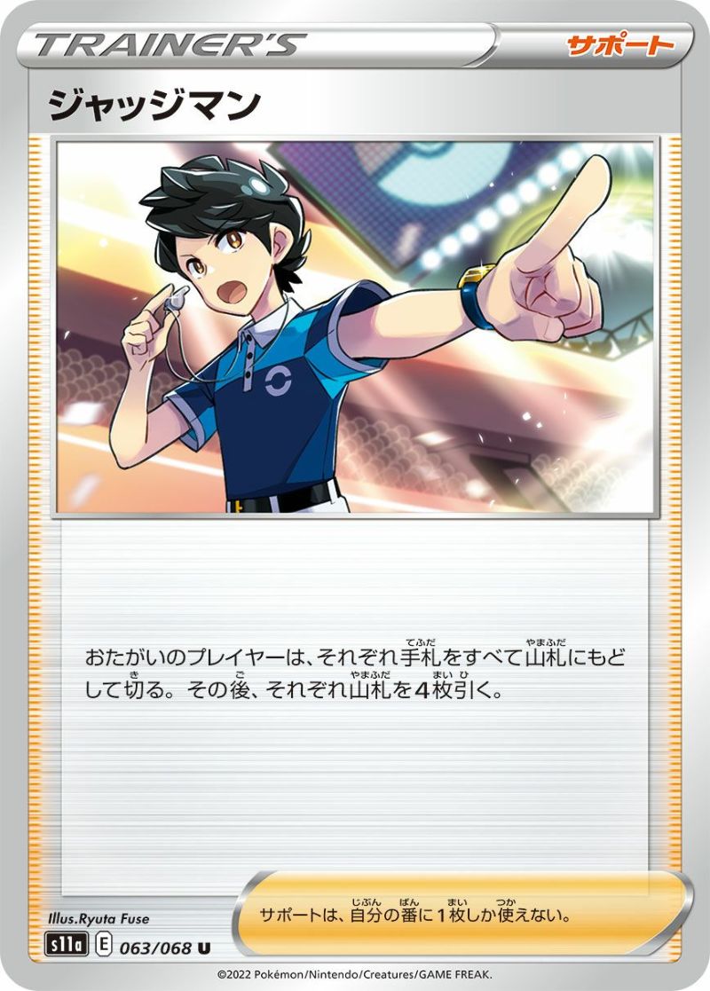 ジャッジマン(063/068)は、強化拡張パック「白熱のアルカナ」に収録されたサポートカードです。このカードを使用すると、お互いのプレイヤーはそれぞれ手札をすべて山札に戻して切り直し、その後、各自4枚のカードを引きます。これにより、相手の手札を減らしつつ、自分の手札をリフレッシュすることが可能です。ただし、サポートカードは自分の番に1枚しか使えないため、使用タイミングを慎重に考える必要があります。