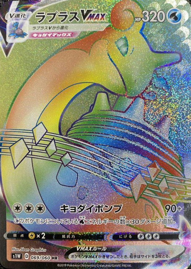 ラプラスVMAX(069/060)[HR]は、拡張パック「ソード」に収録された水タイプのポケモンVMAXで、HPは320です。ワザ「キョダイポンプ」は無色エネルギー3個で90ダメージを与え、このポケモンについている水エネルギーの数×30ダメージを追加します。デッキにおいては、水エネルギーを多く付けることで高火力を狙えるアタッカーとして活躍します。また、HR(ハイパーレア)仕様のため、コレクション価値も高い一枚です。