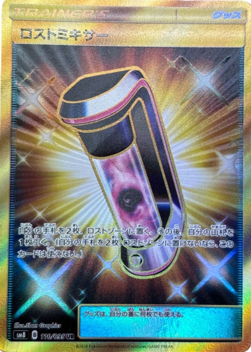 ロストミキサー(110/095)は、拡張パック「超爆インパクト」に収録されたグッズカードで、レアリティはUR(ウルトラレア)です。このカードは、自分の手札を2枚ロストゾーンに置くことで、山札を1枚引く効果を持ちます。手札の不要なカードをロストゾーンに送りつつ、ドローを進めることができ、ロストゾーンを活用するデッキで特に有効です。UR版は、豪華なホログラフィック加工が施され、コレクション性も高い一枚です。