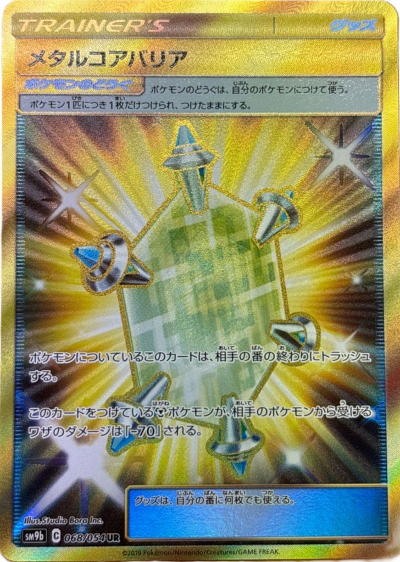 メタルコアバリア(068/054)は、サン&ムーンシリーズの強化拡張パック「フルメタルウォール」に収録されたウルトラレア(UR)のトレーナーズカード(グッズ)です。このカードを鋼タイプのポケモンに付けると、相手のポケモンから受けるワザのダメージを70減らす効果があります。ただし、相手の番の終わりにこのカードはトラッシュされます。防御力を一時的に高めるため、特定の状況でのダメージ軽減に有効です。