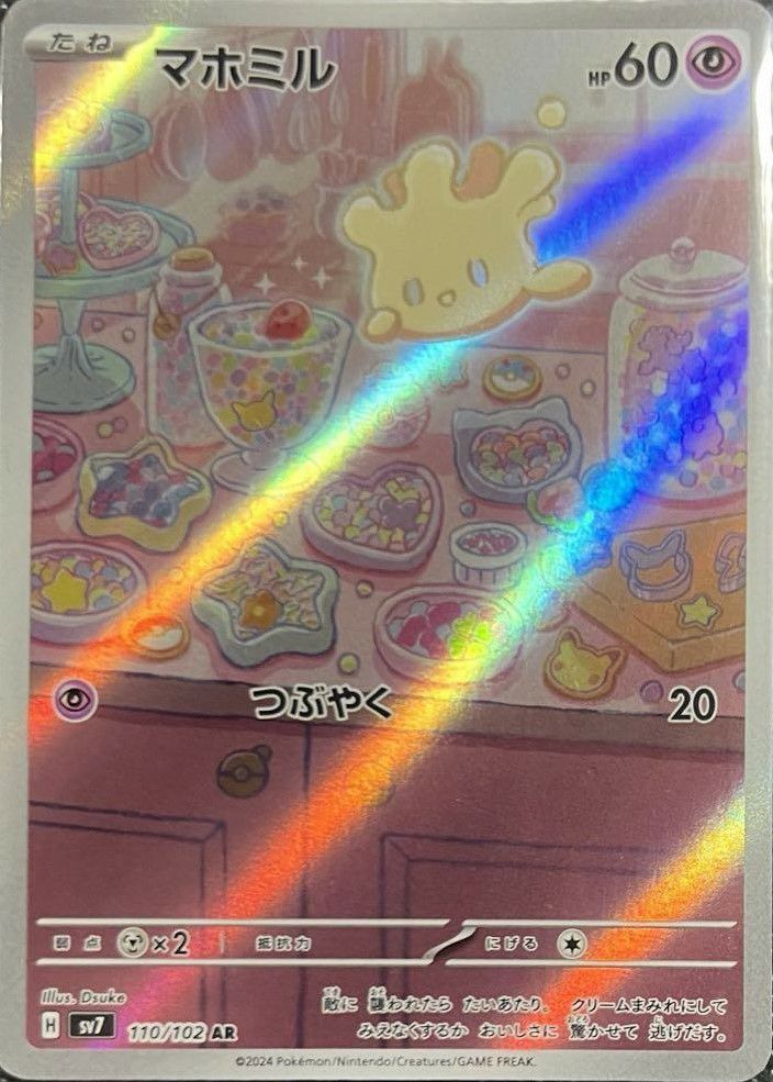 マホミル(110/102)は、拡張パック「ステラミラクル」に収録された超タイプのたねポケモンで、HP60を持ち、ワザ「つぶやく」は超エネルギー1つで20ダメージを与えます。逃げるためのエネルギーコストは無色1つ、弱点は鋼タイプです。アートレア(AR)版のイラストは、マホミルの生態や魅力をアーティスティックに描いた特別なデザインとなっています。