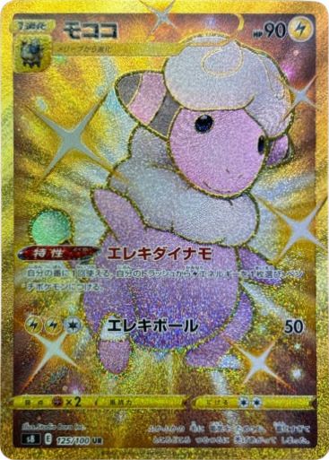 モココ(125/100)は、拡張パック「フュージョンアーツ」に収録されたウルトラレア(UR)の1進化ポケモンで、雷タイプ、HP90を持ちます。特性「エレキダイナモ」により、自分の番に1回、トラッシュから雷エネルギーを1枚選び、ベンチポケモンにつけることができます。ワザ「エレキボール」は雷エネルギー2つと無色エネルギー1つで50ダメージを与えます。弱点は闘タイプ(×2)、逃げるためのエネルギーは2つです。この特性により、雷デッキのエネルギー加速をサポートし、素早い展開が可能となります。UR仕様のカードは、豪華な光沢加工が施され、コレクション性が高いのが特徴です。