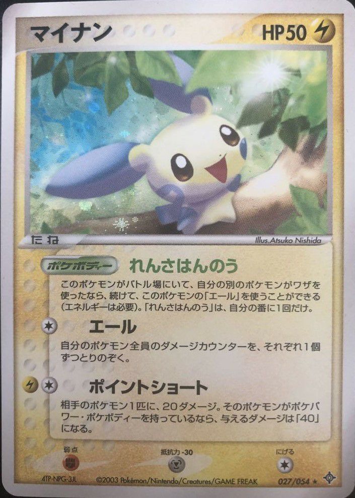 マイナン(027/054)は、拡張パック「ADV 第3弾 天空の覇者」に収録された雷タイプのたねポケモンで、レアリティは★(キラ)です。このカードは、仲間を応援する習性を持つマイナンが描かれており、プラスルとの連携を意識したデザインが特徴です。特に、プラスルと組み合わせることで効果を発揮するワザや特性を持ち、デッキ構築の幅を広げます。また、2003年6月25日に発売されたこのカードは、当時の環境で活躍した一枚であり、現在でもコレクターの間で人気があります。