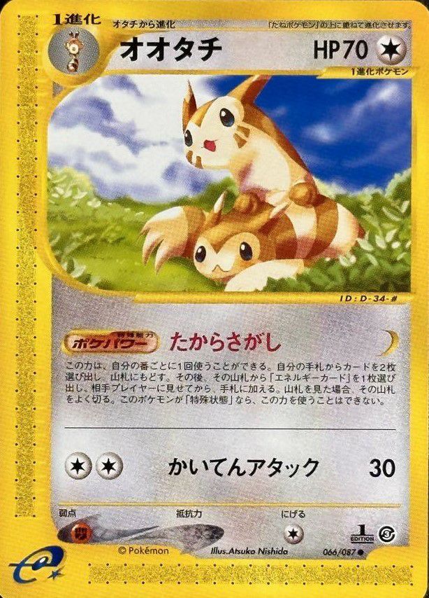 オオタチ(066/087)は、無色タイプの1進化ポケモンで、HP70を持ちます。特性「たからさがし」は、自分の番に1回、手札からカードを2枚山札に戻すことで、山札からエネルギーカードを1枚手札に加えることができます。ワザ「かいてんアタック」は、無色エネルギー2個で30ダメージを与えます。デッキでは、エネルギー供給をサポートする役割を果たします。このカードは、ポケモンカードeシリーズの拡張パック第3弾「海からの風」に収録されています。