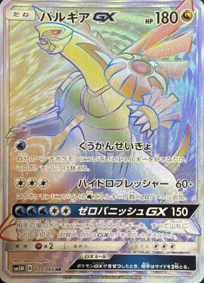 パルキアGX(075/066)は、ドラゴンタイプのたねポケモンで、HPは180です。ワザ「くうかんせいぎょ」は水エネルギー1つで、自分のベンチポケモンについているエネルギーを好きなだけこのポケモンに付け替えます。「ハイドロプレッシャー」は無色エネルギー3つで60ダメージを与え、このポケモンについているエネルギーの数×20ダメージを追加します。GXワザ「ゼロバニッシュGX」は水エネルギー3つと無色エネルギー2つで150ダメージを与え、相手の場のポケモンについているエネルギーをすべて山札に戻して切る効果があります。弱点はフェアリータイプで、逃げるためのコストは無色エネルギー3つです。デッキでは、エネルギーの付け替えや高火力のワザを活用し、相手のエネルギーを制限する戦略が可能です。HR(ハイパーレア)版のイラストは、虹色のホログラフィック加工が施された特別なデザインが特徴です。