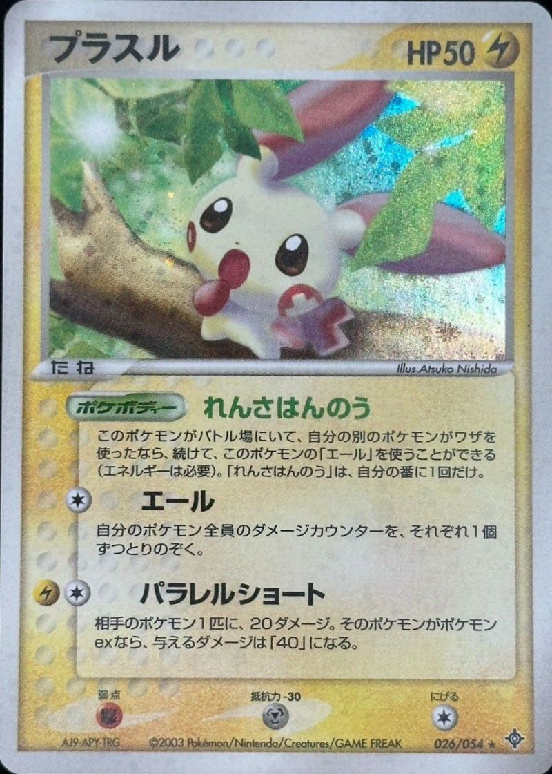 プラスル(026/054)は、拡張パック「ADV 第3弾 拡張パック 天空の覇者」に収録された雷タイプのたねポケモンで、HPは50です。特性「れんさはんのう」により、このポケモンがバトル場にいて、自分の別のポケモンがワザを使った後に、エネルギーなしで「エール」を使用できます。「エール」は、自分のポケモン全員からダメージカウンターをそれぞれ1個ずつ取り除く効果があります。ワザ「パラレルショート」は、相手のポケモン1匹に20ダメージを与え、相手がポケモンexの場合、ダメージは40になります。弱点は闘タイプ(×2)、抵抗力は鋼タイプ(-30)、逃げるためのコストは1です。このカードは、特性を活かして味方のダメージを軽減しつつ、相手のポケモンexに対して効果的な攻撃が可能です。