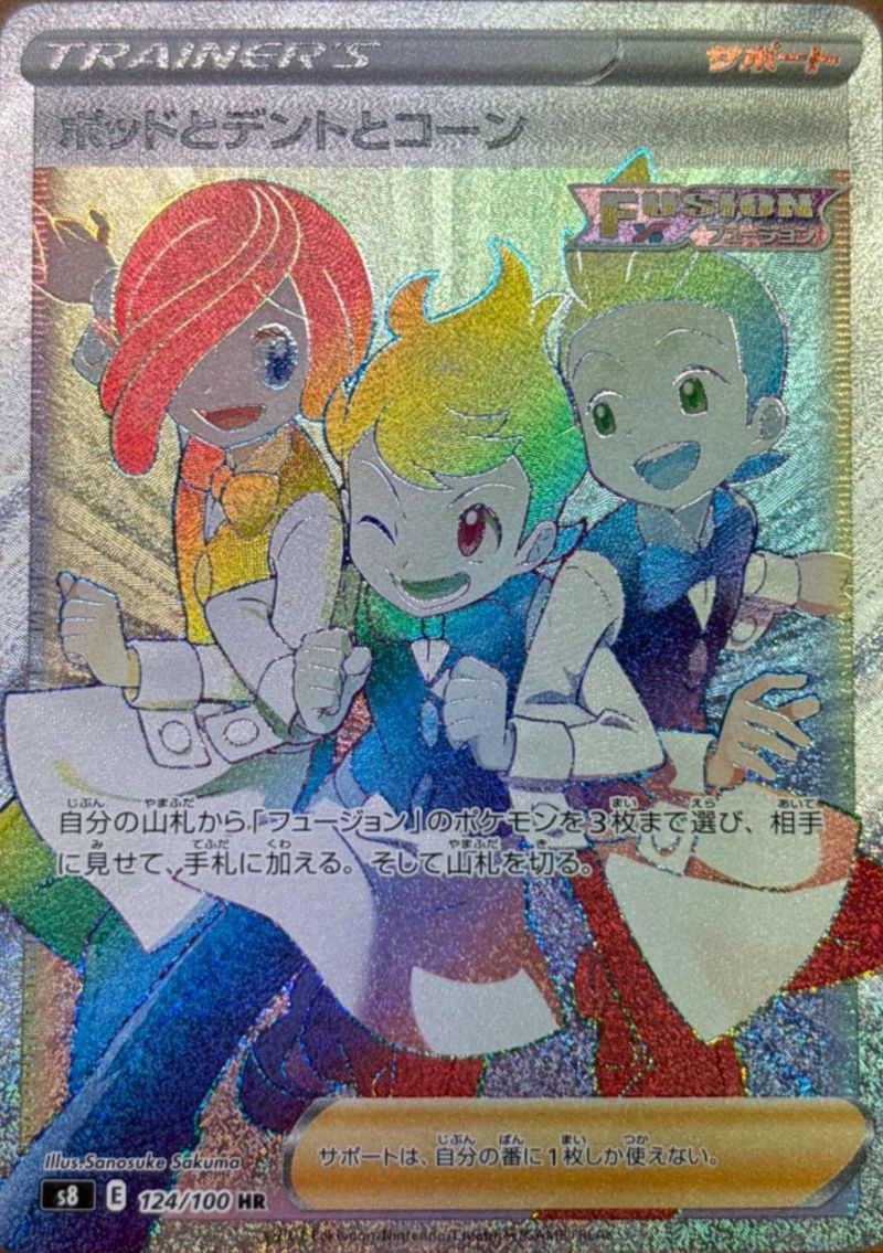 「ポッドとデントとコーン」(124/100)は、拡張パック「フュージョンアーツ」に収録されたハイパーレア(HR)のサポートカードです。このカードは、自分の山札から「フュージョン」のポケモンを3枚まで選び、相手に見せて手札に加える効果を持ち、デッキの展開をサポートします。イラストは佐久間さのすけ氏が担当し、ポッド、デント、コーンの三兄弟が描かれています。その希少性と人気キャラクターのデザインから、コレクターの間で高い評価を受けています。