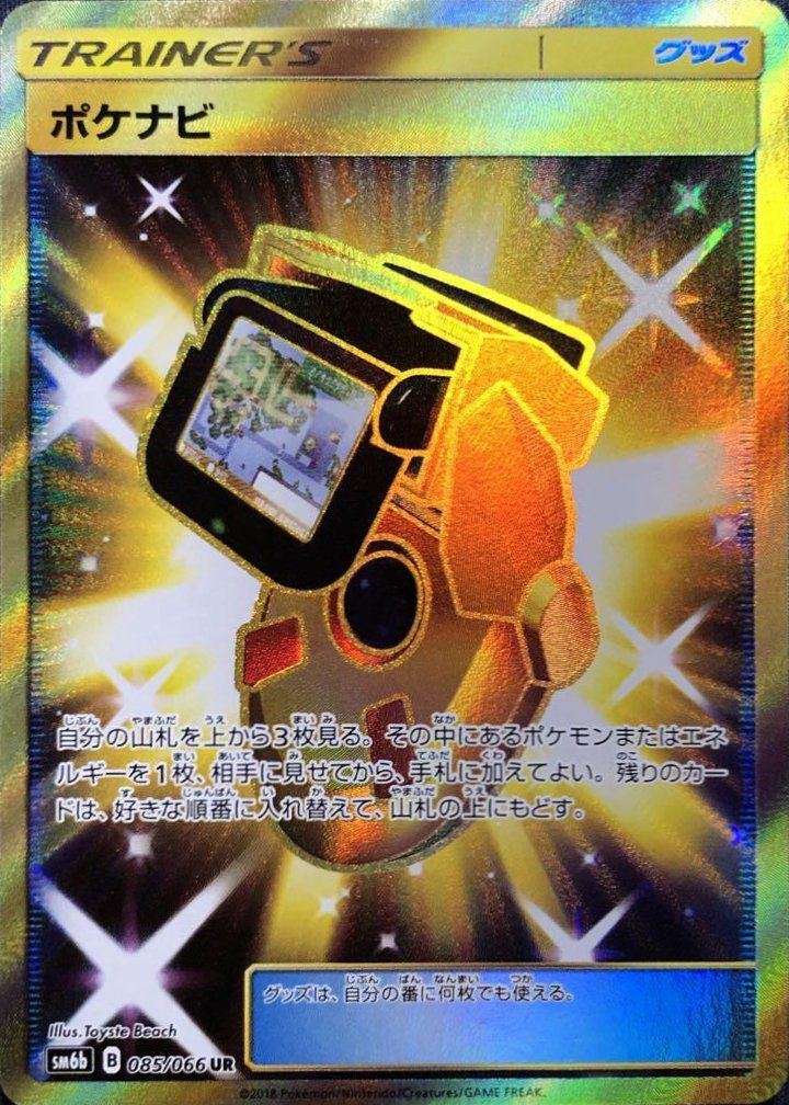 ポケナビ(085/066)は、トレーナーズのグッズカードで、自分の山札の上から3枚を見て、その中からポケモンまたはエネルギーを1枚選び、相手に見せてから手札に加えることができます。残りのカードは好きな順番に入れ替えて山札の上に戻します。デッキの安定性を高め、必要なカードを迅速に手札に加えるサポート役として活躍します。UR版は、金色の枠で囲まれたポケナビがCGで描かれた豪華なデザインが特徴です。