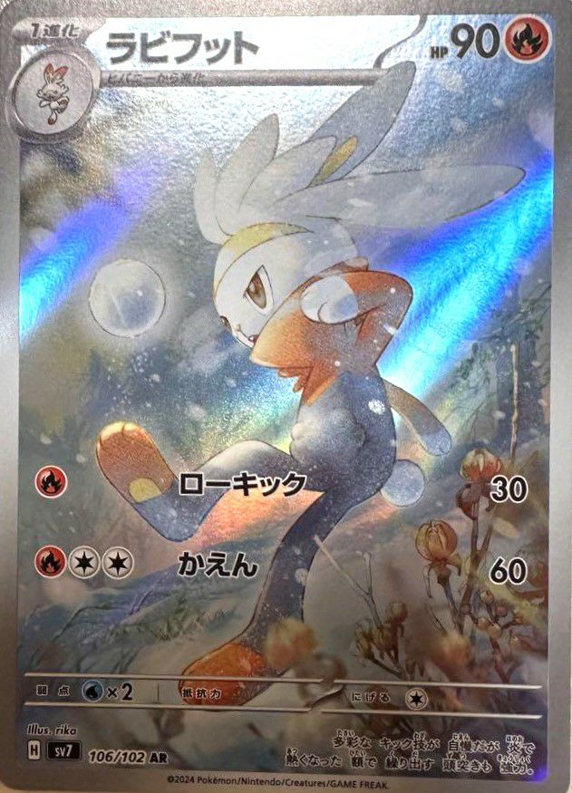 ラビフット(106/102)[AR]は、拡張パック「ステラミラクル」に収録された炎タイプの1進化ポケモンで、HPは90です。ワザ「ローキック」は30ダメージを与え、ワザ「かえん」は60ダメージを与えます。デッキにおいては、進化先のエースバーンやエースバーンexへの布石として活用されます。また、AR(アートレア)仕様のため、美麗なイラストが特徴で、コレクション価値も高い一枚です。