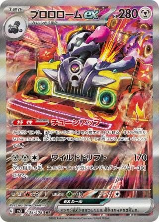 ブロロロームex(135/108)は、拡張パック「黒炎の支配者」に収録された鋼タイプの1進化ポケモンで、HPは280です。特性「チューンアップ」により、このポケモンは「ポケモンのどうぐ」を最大4枚まで付けることができます。ただし、この特性がなくなると、どうぐは1枚になるようにトラッシュします。ワザ「ワイルドドリフト」は鋼エネルギー2つと無色エネルギー1つで170ダメージを与え、次の相手の番、このポケモンが受けるワザのダメージを30減らします。弱点は炎タイプ、抵抗力は草タイプで、逃げるためのコストは1です。スペシャルアートレア(SAR)版のイラストは、ブロロロームexが力強く描かれており、コレクターから高い評価を受けています。