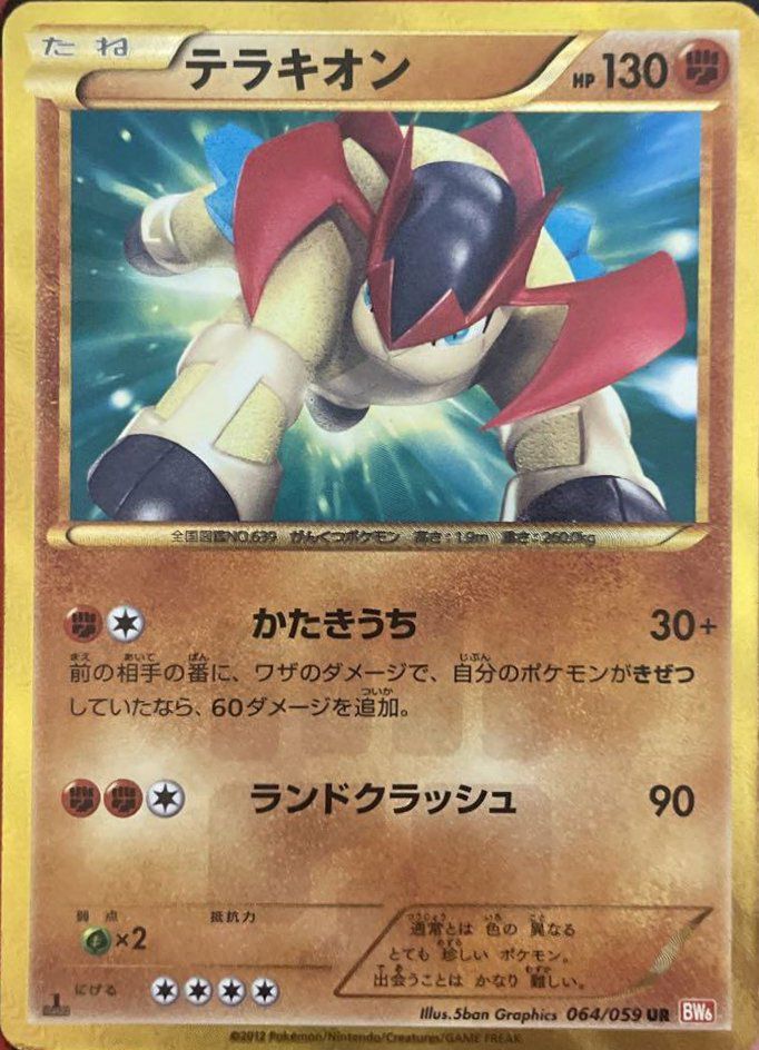テラキオン(064/059)[UR]は、拡張パック「コールドフレア」に収録された闘タイプのたねポケモンです。ワザ「がんせきほう」は90ダメージを与え、次の自分の番、このポケモンは「がんせきほう」を使えません。また、ワザ「せいなるつるぎ」は100ダメージを与えます。このカードは、高い攻撃力を持ち、相手のポケモンに大きなダメージを与える戦略で活躍が期待されます。ウルトラレア(UR)版は、特別なイラストと光沢加工が施され、コレクション性も高い一枚です。