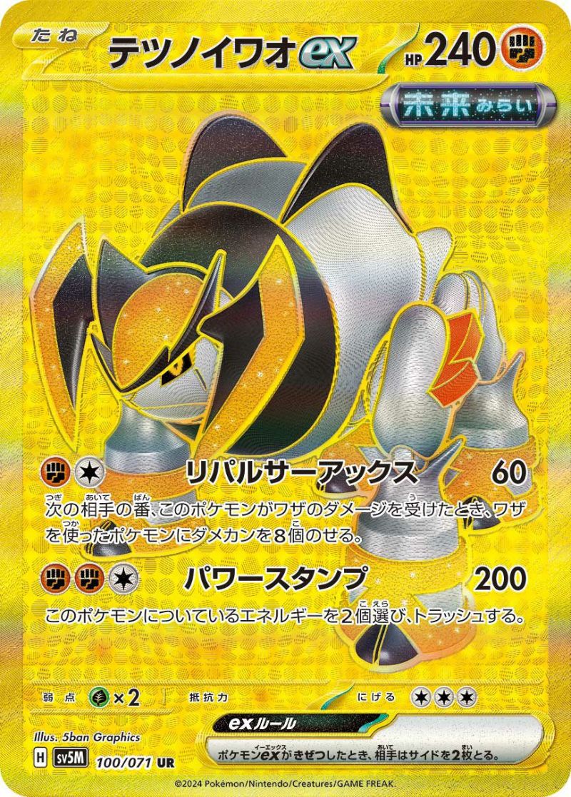 テツノイワオex(100/071)[UR]は、拡張パック「サイバージャッジ」に収録された闘タイプのたねポケモンexです。ワザ「リパルサーアックス」は60ダメージを与え、次の相手の番にこのポケモンがワザのダメージを受けたとき、ワザを使ったポケモンにダメカンを8個のせます。また、「パワースタンプ」は200ダメージを与え、このポケモンについているエネルギーを2個トラッシュします。このカードは、攻守に優れた性能を持ち、特に「リパルサーアックス」による反撃効果で相手にプレッシャーを与える戦略で活躍が期待されます。ウルトラレア(UR)版は、特別なイラストと光沢加工が施され、コレクション性も高い一枚です。