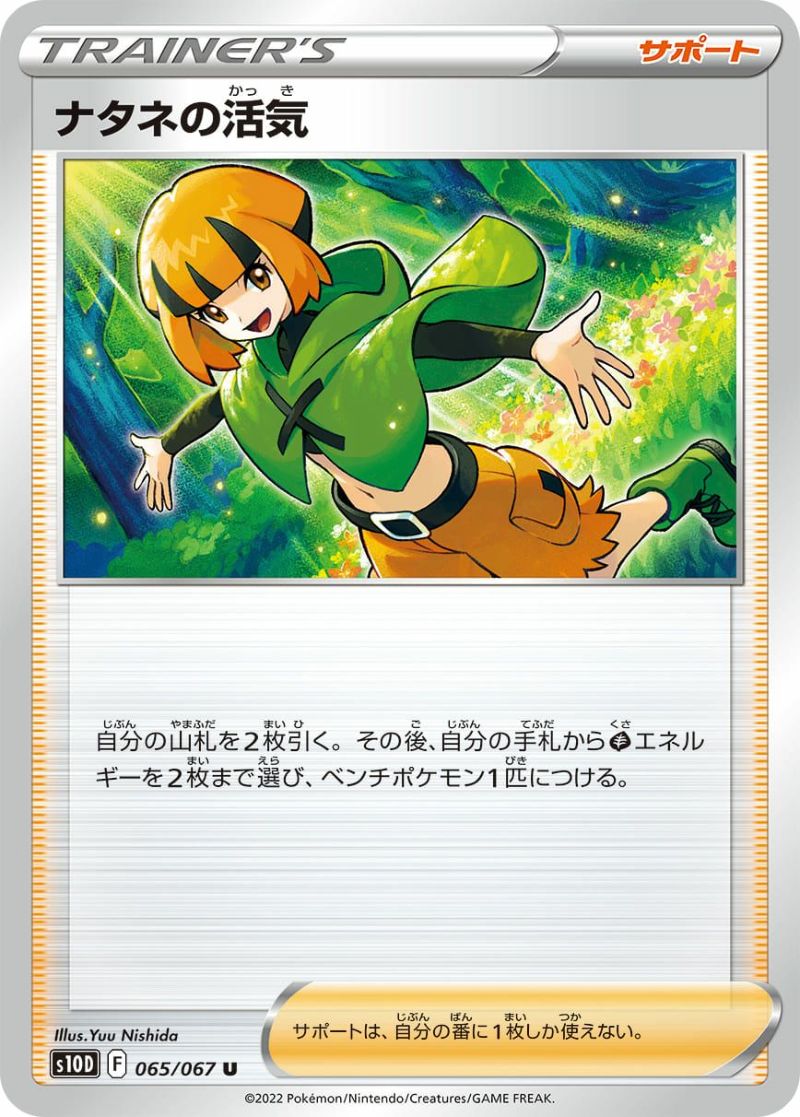 ナタネの活気(065/067)は、拡張パック「タイムゲイザー」に収録されたサポートカードです。このカードを使用すると、まず自分の山札を2枚引き、その後、手札から草エネルギーを最大2枚まで選び、ベンチポケモン1匹に付けることができます。これにより、ドローとエネルギー加速を同時に行うことが可能で、特に草タイプのデッキにおいて序盤からの展開をサポートします。サポートカードは1ターンに1枚しか使用できないため、使用タイミングを見極めることが重要です。