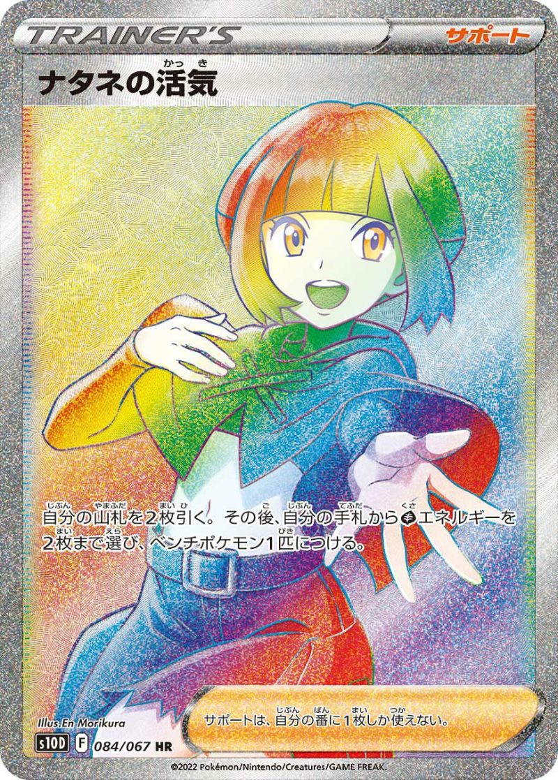 ナタネの活気(084/067)は、拡張パック「タイムゲイザー」に収録されたサポートカードのハイパーレア(HR)仕様です。効果は、自分の山札を2枚引き、その後、手札から草エネルギーを最大2枚まで選び、ベンチポケモン1匹に付けるというものです。これにより、ドローとエネルギー加速を同時に行うことが可能です。イラストはEn Morikura氏が手掛けています。