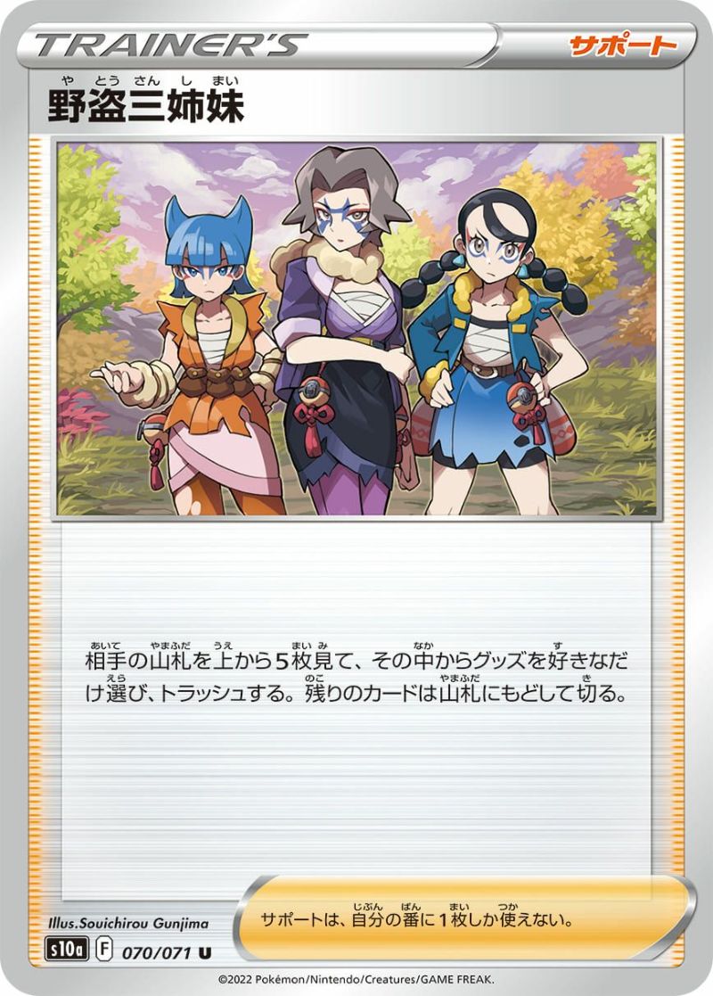 野盗三姉妹(070/071)は、強化拡張パック「ダークファンタズマ」に収録されたサポートカードです。このカードを使用すると、相手の山札の上から5枚を確認し、その中からグッズを任意の枚数選んでトラッシュできます。残りのカードは山札に戻して切ります。これにより、相手の戦略を妨害しつつ、自分に有利な状況を作り出すことが可能です。イラストは軍島曹一郎氏が担当しています。